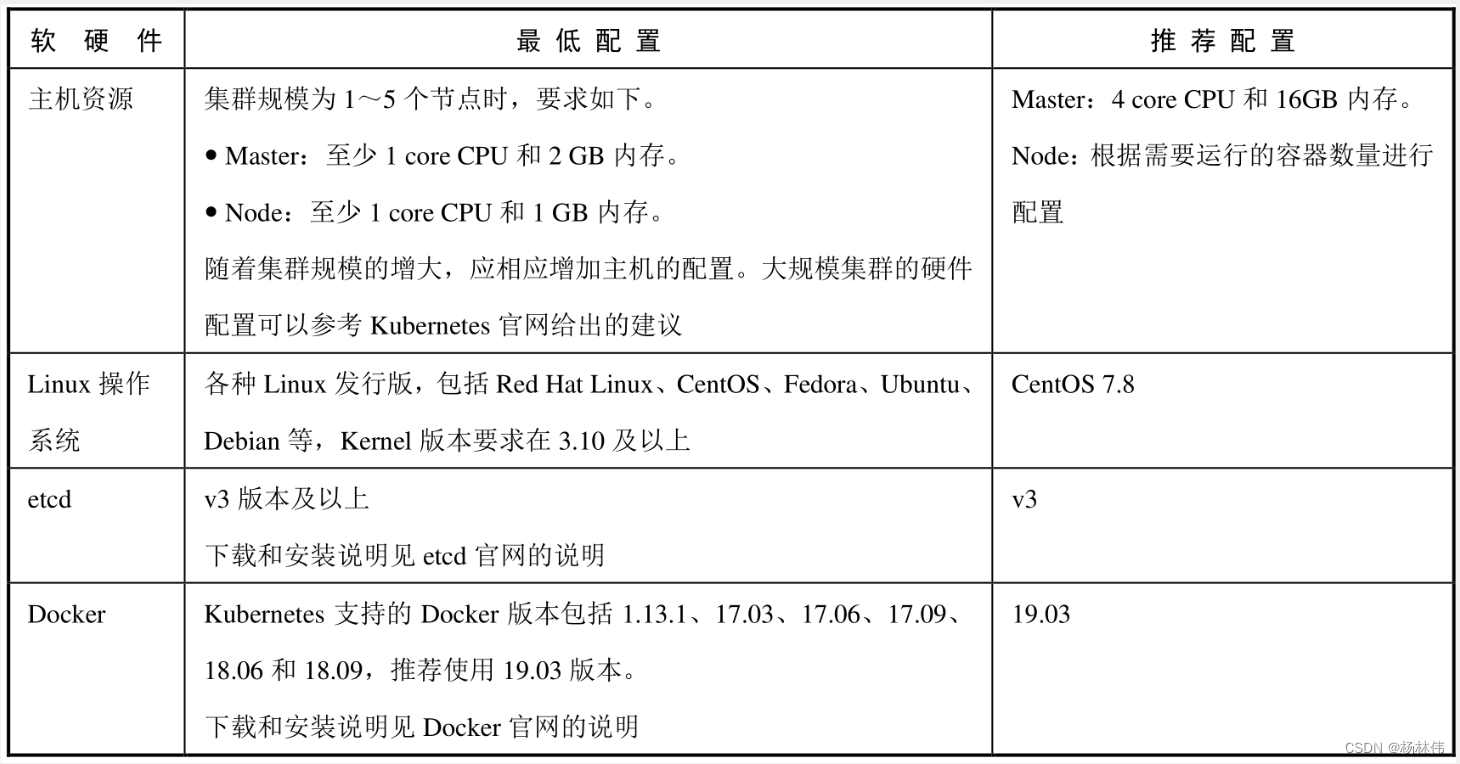安装 Kubernetes 对软件和硬件的系统要求下图所示: