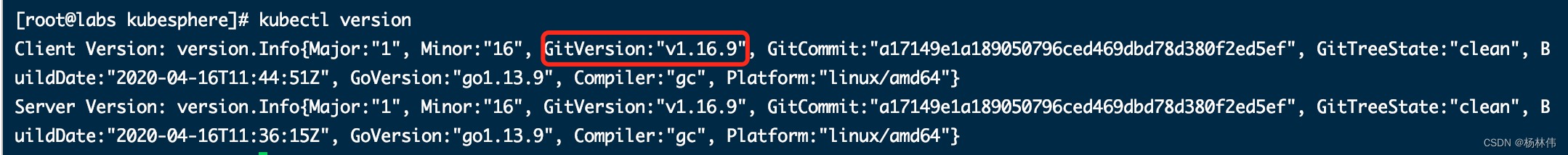Kubespherek8s版本要求详情地址v1.0.0不支持k8s基础上安装https://v1-0.docs.kubesphere.io/docs/zh-CN/installation/intro/v2.0.x1.13.0 ≤ K8s Version < 1.16https://v2-0.docs.kubesphere.io/docs/zh-CN/installation/install-on-k8s/V2.1.x1.15.x ≤ K8s version ≤ 1.17.xhttps://v2-1.docs.kubesphere.io/docs/zh-CN/installation/prerequisites/V3.0.01.15.x,1.16.x,1.17.x,1.18.xhttps://v3-0.docs.kubesphere.io/zh/docs/installing-on-kubernetes/introduction/prerequisites/V3.1.xv1.17.x,v1.18.x,v1.19.x 或 v1.20.x。https://v3-1.docs.kubesphere.io/zh/docs/installing-on-kubernetes/introduction/prerequisites/V3.2.xv1.19.x,v1.20.x,v1.21.x 或 v1.22.x(实验性支持)。https://kubesphere.io/zh/docs/installing-on-kubernetes/introduction/prerequisites/查看k8s的版本: