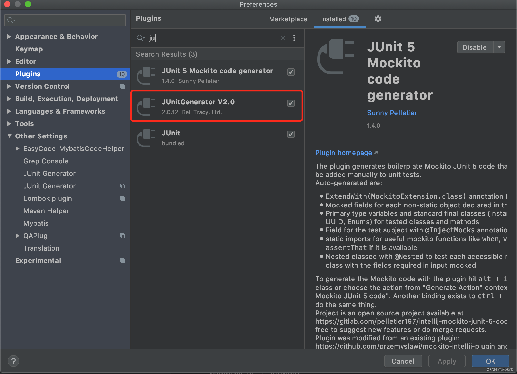 安装JunitGenerator v2.0插件: 重启IDEA 配置插件 随便打开一个类,右键,选择Generate… -> 选择Generate选择JunitTest->Junit4 最后在会自动生成目录及单元测试代码,如下: