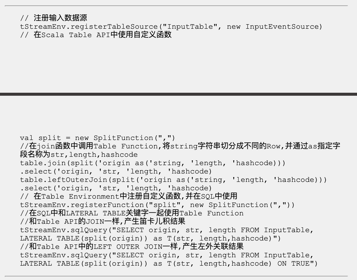 举例:通过自定义 SplitFunction Class 继承 TableFunction接口,实现根据指定切割符来切分输入字符串,并获取每个字符的长度和 HashCode 的功能,然后在 Table Select操作符和SQL语句中使用定义的 SplitFunction。