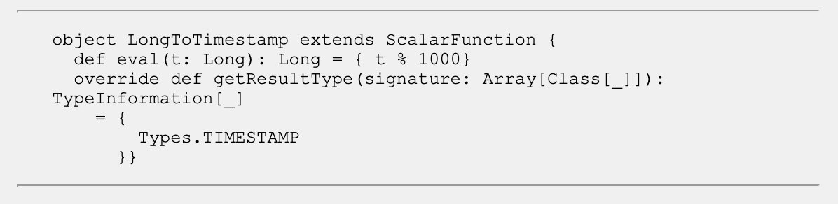例如:在 Table API和SQL中可能需要使用 Types. TIMESTAMP 数据类型,但是基于 ScalarFunction得出的只能是Long 类型,因此可以通过实现getResultType:方法对结果数据进行类型转换,从而返回 Timestamp 类型。