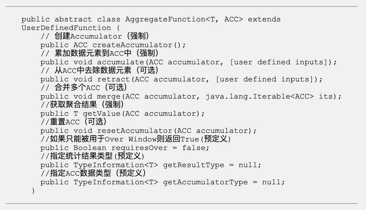 在 AggregateFunction 抽象类中包含了必须实现的方法createAccumulator()、accumulate()、getValue(),其中:
