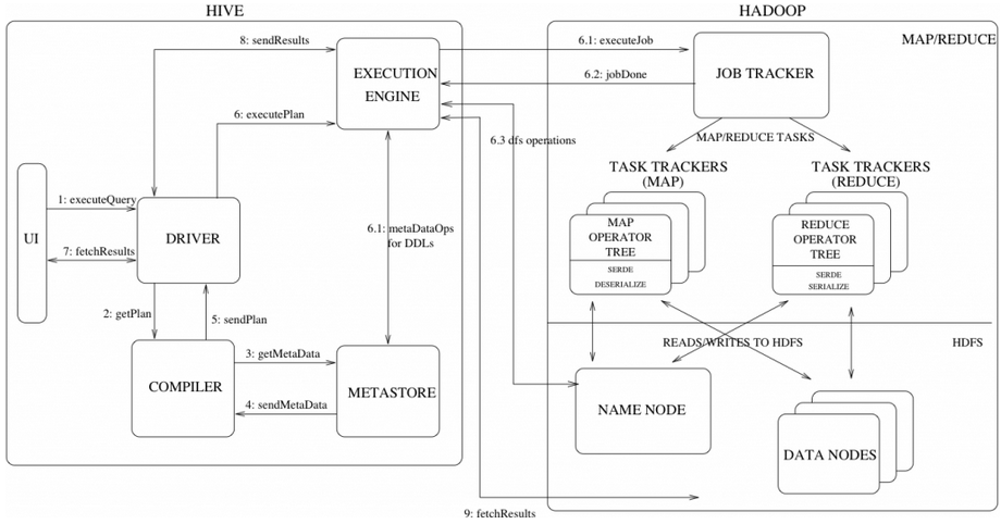 经过上面架构图的描述,网上找了份Hive的工作原理图,大家可以大致感受下: 因为本文是入门篇,所以这里不再详述,后续会编写相应的博客来描述它的工作原理。