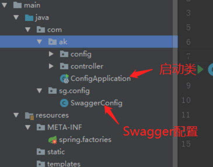 spring.facotries是加载不了的,启动类只能加载config和controller里面的类,为了能加载Swagger配置,我们可以在resources文件夹里面新建META-INF文件夹,里面再新建spring.factories文件,配置内容如下: