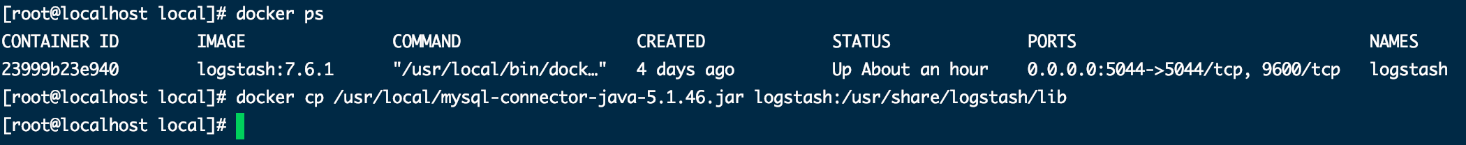 docker cp /usr/local/mysql-connector-java-5.1.46.jar logstash:/usr/share/logstash/lib