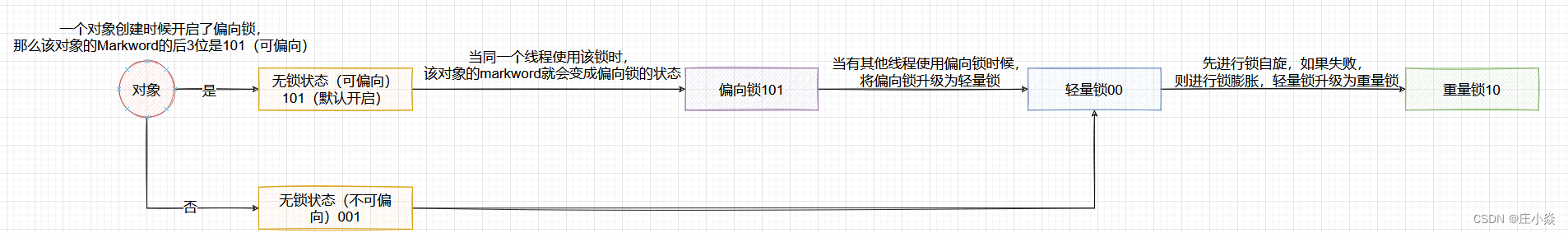 - 锁升级:JD6之后分为无锁,偏向锁,轻量级锁,重量级锁。其中偏向锁->轻量级锁->重量级锁的升级过程不可逆。