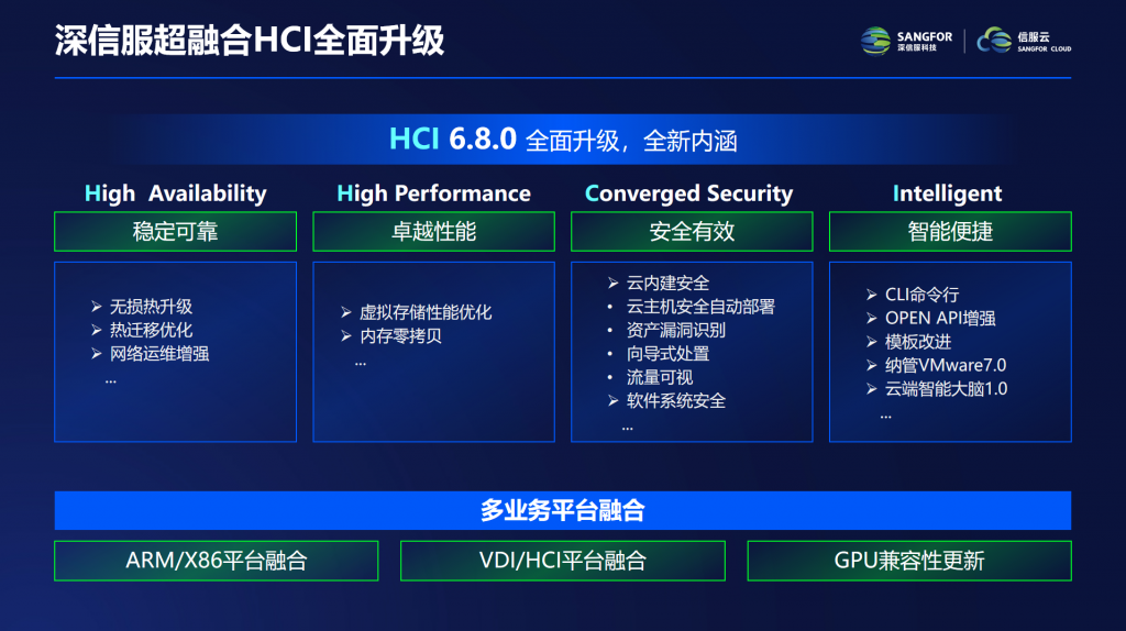 特性二:多架构融合,支撑“端—边—云”演进 面对用户对IT基础架构云化演进的需求,深信服超融合实现了多架构融合:一是HCI和VDI(桌面云)平台统一,平台稳定性可靠性更优,桌面云用户管理规模扩大十倍,从以前的1000可以扩展到10000;二是ARM和X86平台统一,软件能力同步更新,持续增强了信创场景竞争力。