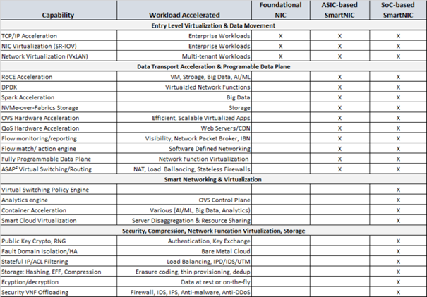 上图可见,英伟达认为基于SoC的智能网卡就是DPU,DPU是功能最强大的SmartNIC,DPU新增了虚拟化,网络功能虚拟化(NFV),安全,存储等功能,这种说法也基本符合我们看到的趋势。