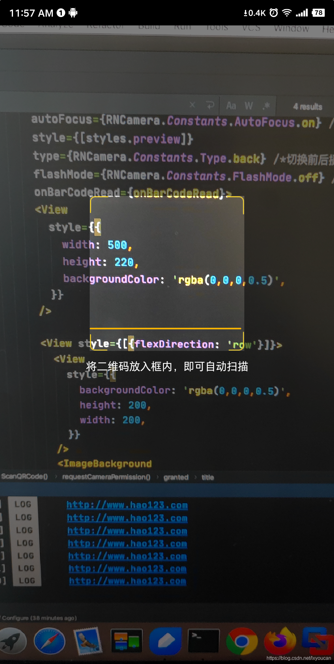 import {RNCamera} from 'react-native-camera'; import React, {useEffect, useRef} from 'react'; import { StyleSheet, Animated, PermissionsAndroid, default as Easing, ImageBackground, View, Text, } from 'react-native'; let camera; const ScanQRCode = () => { const moveAnim = useRef(new Animated.Value(-2)).current; useEffect(() => { requestCameraPermission(); startAnimation(); // eslint-disable-next-line react-hooks/exhaustive-deps }, []); //请求权限的方法 const requestCameraPermission = async () => { try { const granted = await PermissionsAndroid.request( PermissionsAndroid.PERMISSIONS.CAMERA, { title: '申请摄像头权限', message: '扫描二维码需要开启相机权限', buttonNeutral: '等会再问我', buttonNegative: '不行', buttonPositive: '好吧', }, ); if (granted === PermissionsAndroid.RESULTS.GRANTED) { console.log('现在你获得摄像头权限了'); } else { console.log('用户没有允许相机权限'); } } catch (err) { console.warn(err); } }; /** 扫描框动画*/ const startAnimation = () => { Animated.sequence([ Animated.timing(moveAnim, { toValue: 200, duration: 1500, easing: Easing.linear, useNativeDriver: false, }), Animated.timing(moveAnim, { toValue: -1, duration: 1500, easing: Easing.linear, useNativeDriver: false, }), ]).start(() => startAnimation()); }; const onBarCodeRead = (result) => { const {data} = result; //只要拿到data就可以了 //扫码后的操作 console.log(data); alert(data); }; return ( { camera = ref; }} autoFocus={RNCamera.Constants.AutoFocus.on} /*自动对焦*/ style={[styles.preview]} type={RNCamera.Constants.Type.back} /*切换前后摄像头 front前back后*/ flashMode={RNCamera.Constants.FlashMode.off} /*相机闪光模式*/ onBarCodeRead={onBarCodeRead}>{ width: 500, height: 220, backgroundColor: 'rgba(0,0,0,0.5)', }} /> { backgroundColor: 'rgba(0,0,0,0.5)', height: 200, width: 200, }} />{width: 200, height: 200}}> { backgroundColor: 'rgba(0,0,0,0.5)', height: 200, width: 200, }} />{ flex: 1, backgroundColor: 'rgba(0, 0, 0, 0.5)', width: 500, alignItems: 'center', }}>将二维码放入框内,即可自动扫描); }; const styles = StyleSheet.create({ container: { flex: 1, flexDirection: 'row', }, preview: { flex: 1, justifyContent: 'center', alignItems: 'center', }, rectangleContainer: { flex: 1, justifyContent: 'flex-end', alignItems: 'center', }, rectangle: { height: 200, width: 200, borderWidth: 1, borderColor: '#fcb602', backgroundColor: 'transparent', borderRadius: 10, }, rectangleText: { flex: 0, color: '#fff', marginTop: 10, }, border: { flex: 0, width: 196, height: 2, backgroundColor: '#fcb602', borderRadius: 50, }, }); export default ScanQRCode;