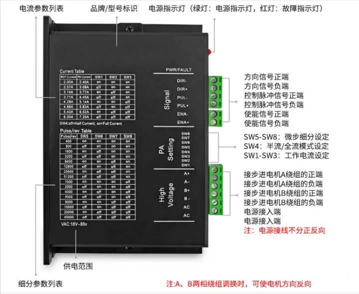 6、接电机相线端子:接电机线。任意对调A相、或者B相绕组接线,可以改变电机运行方向。不同电机绕组接线方式请参考两相步进电机接线分析。