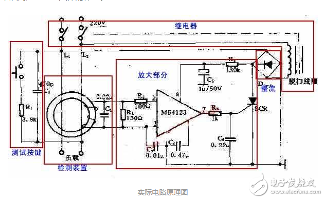 如上图,在输入端放置一个继电器控制电路通断,继电器的控制线圈串联在整流电路中,正常情况下,整流输出端只有一个很小的负载(放大器),所以流过继电器控制线圈的电流非常小,不足以将输入端切断。 M54123是一个放大器,当发生触电事故时,将感应线圈得到的电压放大,然后驱动晶闸管SCR导通, SCR是并联在全桥整流电路的输出端的,当SCR导通时,相当于把整流电路输出端短路,这时流过继电器控制线圈的电流迅速增大,将输入端电路强行断开。另外,为了防止漏电保护器失效,我们设置了一个电路测试功能安全,如上图,按键通过一个3.9K的电阻连接到火线和零线上,并且这个回路不通过磁芯,当按键按下时,部分电流通过按键流回零线,导致磁芯上火线和零线中的电流不同,从而模拟了人体触电,来判断保护机制是否能够正常工作。所以,大家在安装完漏电保护器时请务必按一下测试键来验证你装的漏电保护器能否正常工作。