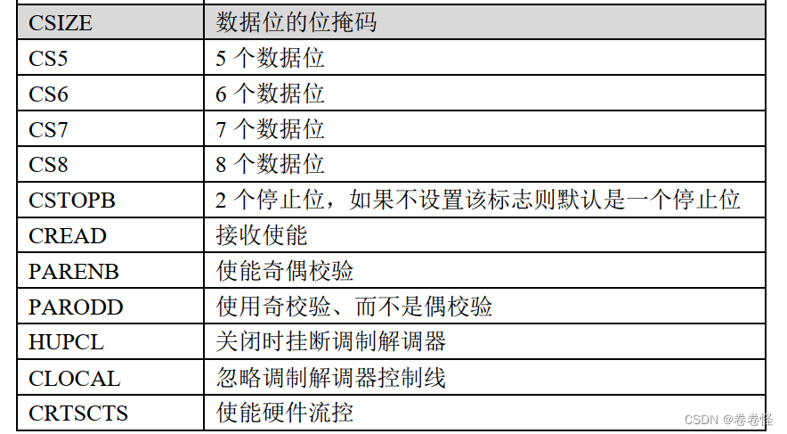 停止位则是通过设置 c_cflag 成员的 CSTOPB 标志而实现的。若停止位为一个比特, 则清除 CSTOPB 标志;若停止位为两个,则添加 CSTOPB 标志即可。