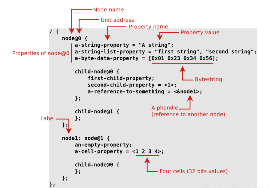注:“/”是根节点,每个设备树文件只有一个根节点。在设备树文件中会发现有的文件下也有“/”根节点,这两个“/”根节点的内容会合并成一个根节点。