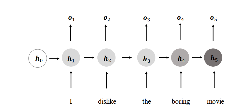 Memory 机制实现为一个状态张量,状态张量h0为初始的内存状态, 可以初始化为全 0。除了原来的𝑾xh参数共享外, 额外增加了一个𝑾hh参数, 每个时间戳𝑡上状态张量 刷新机制为:,经过𝑠个词向量的输入后得到网络最终的状态张量 h𝑠, h𝑠较好地代表了句子的全局语义信息