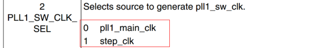 * 当修改完pll1_main_clk以后在将pll1_sw_clk切换回pll1_main_clk。而step_clk的时钟源可以选择