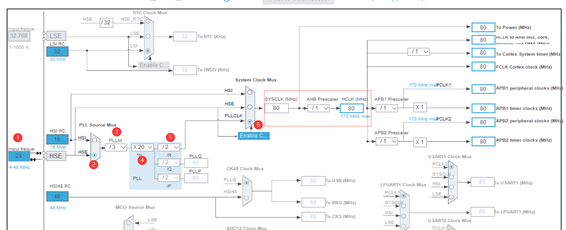 选择高速外部时钟设置为24Mhz,然后经过 (/3) --> (x20) -->(/2),然后选择PLLCLK时钟源,最终得到SYSCLK,时钟频率80Mhz