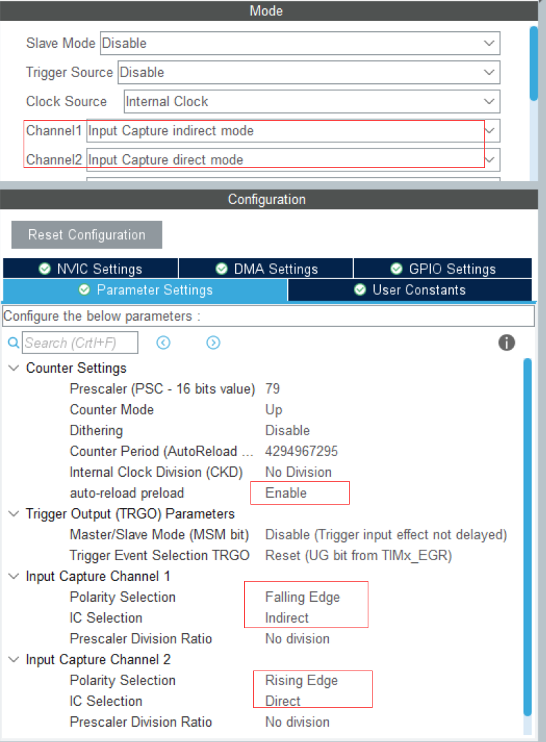 采用定时器2的通道2作为信号的输入,必须将通道2设置为直接捕获模式并且上升沿触发,通道1间接捕获模式并且下降沿触发。注意:使能自动预载值。