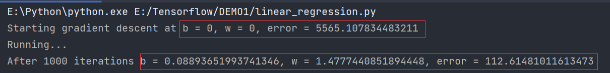 [b, w] = gradient_descent_runner(points, initial_b, initial_w, learning_rate, num_iterations)