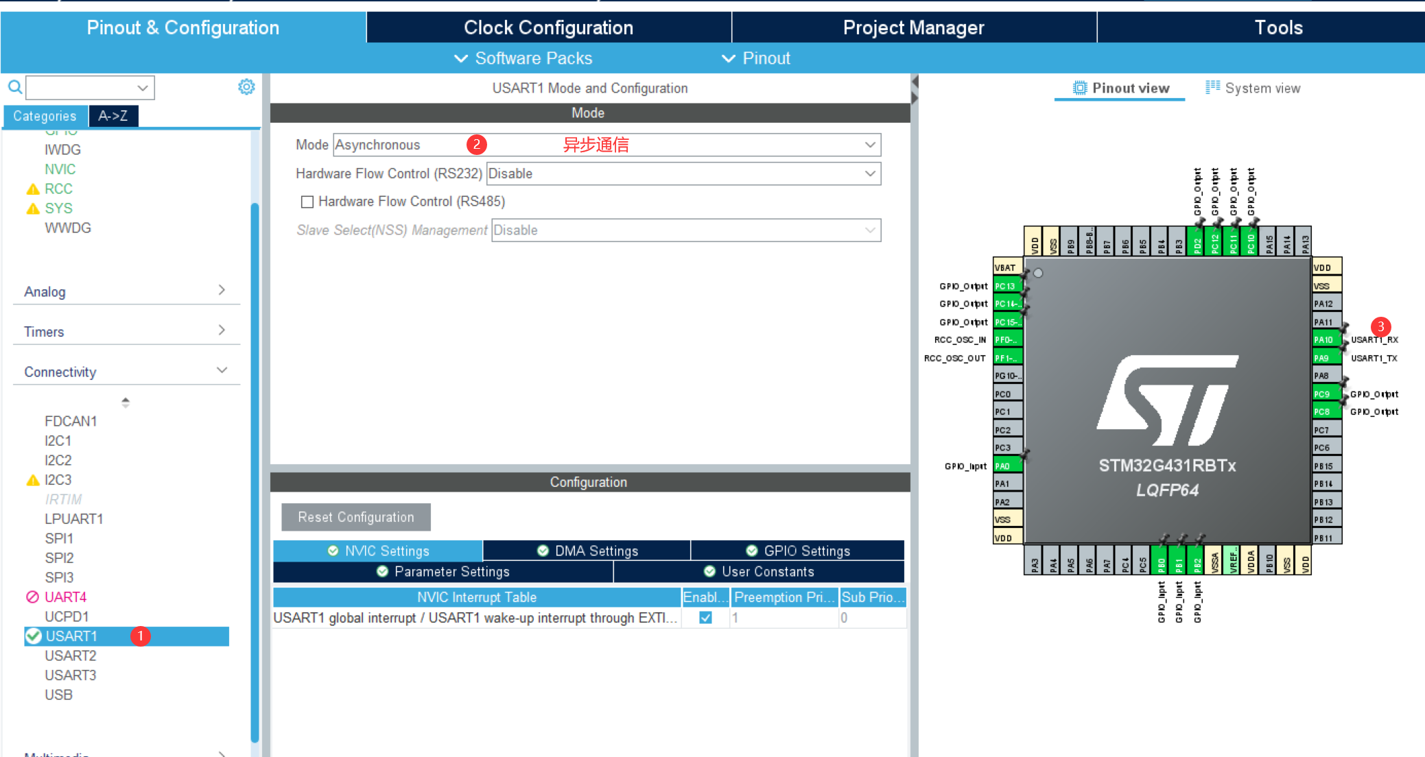 先配置串口的引脚映射到复用功能(PA9–>USART_TX; PA10–>USART_RX),这里我们选择的是异步通信,这里一定要手动修改USART1的TX,RX。因为它默认的不是PA9和PA10引脚。