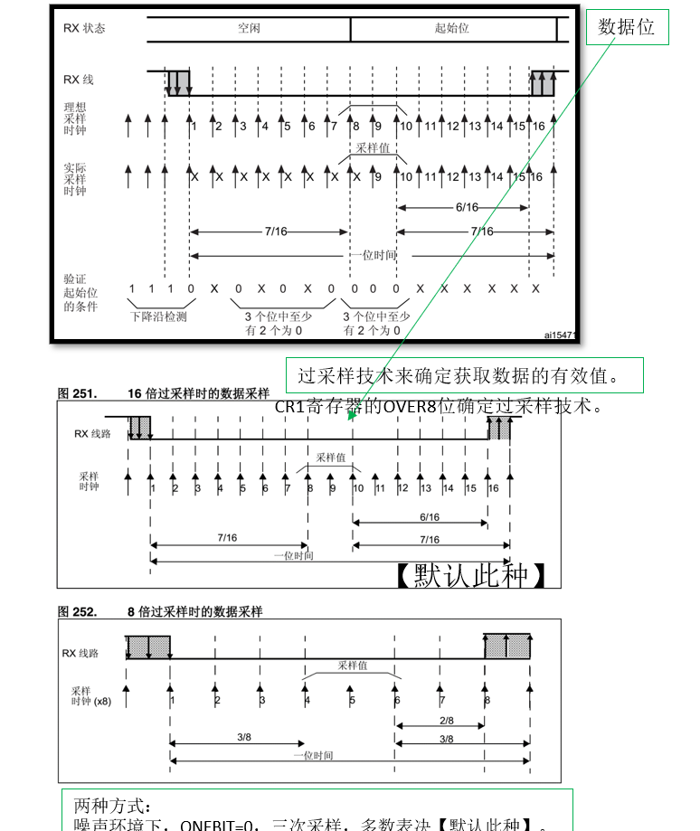 数据接收过程:数据从RX先进入到接收移位寄存器,数据缓存到接收缓存寄存器,然后后进入到接收数据寄存器,最终供CPU或者DMA来进行读取该寄存器,完成数据接收