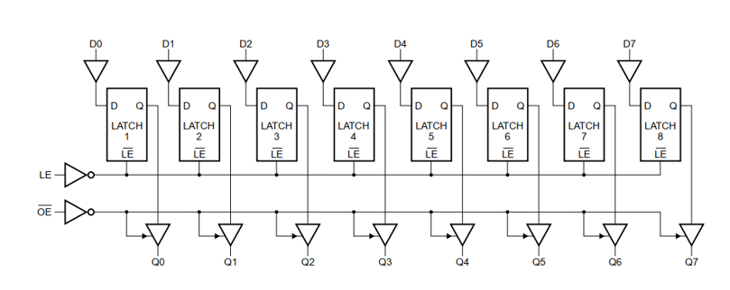 当LE为高电平时,D与Q同时为H或L,处于直通状态 当LE为低电平时,无论D为何种电平,Q都保持上一次的数据状态,处于锁存状态