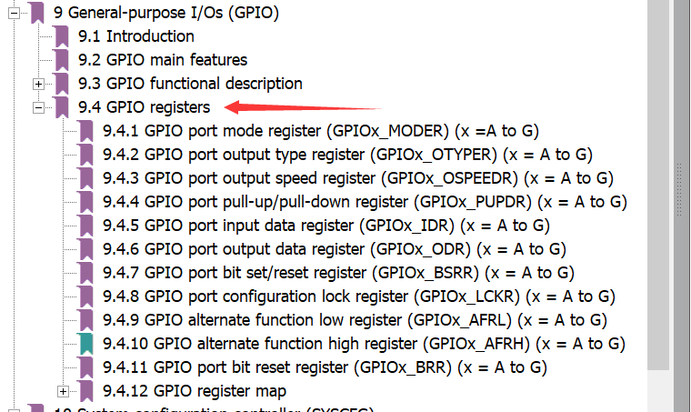 GPIOx_MODER:GPIO 端口模式寄存器 GPIOx_OTYPER :GPIO 端口输出类型寄存器 GPIOx_OSPEEDR :GPIO 端口输出速度寄存器 GPIOx_PUPDR :GPIO 端口上拉/下拉寄存器 GPIOx_IDR :GPIO 端口输入数据 GPIOx_ODR :GPIO 端口输出数据寄存器 GPIOx_BSRR :GPIO 端口置位/复位寄存器 GPIOx_LCKR :GPIO 端口配置锁定寄存器 GPIOx_AFRL :GPIO 复用功能低位寄存器 GPIOx_AFRH :GPIO 复用功能高位寄存器 GPIOx_BRR:GPIO位复位寄存器