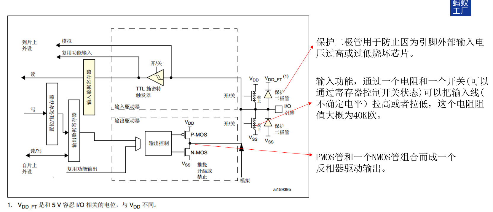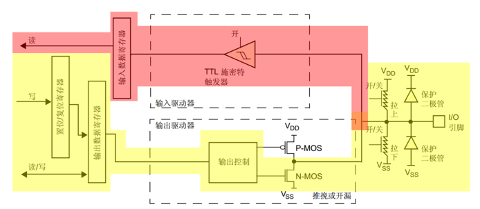 3.普通IO输入 输入为低电平0时,上下拉电阻处于关闭状态,施密特触发器为打开状态 但是,若输入为高电平时要考虑输入电压的大小,如果电压过大必须进行稳压,否则会烧坏电路,这就是包含二极管的作用