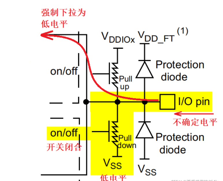 3.输入下拉模式输入下拉模式: 与输入浮空模式相比较,不同之处在于内部有一个下拉电阻连接到 VSS(输入下拉模式下,下拉电阻开关接通,阻值约 30-50K)