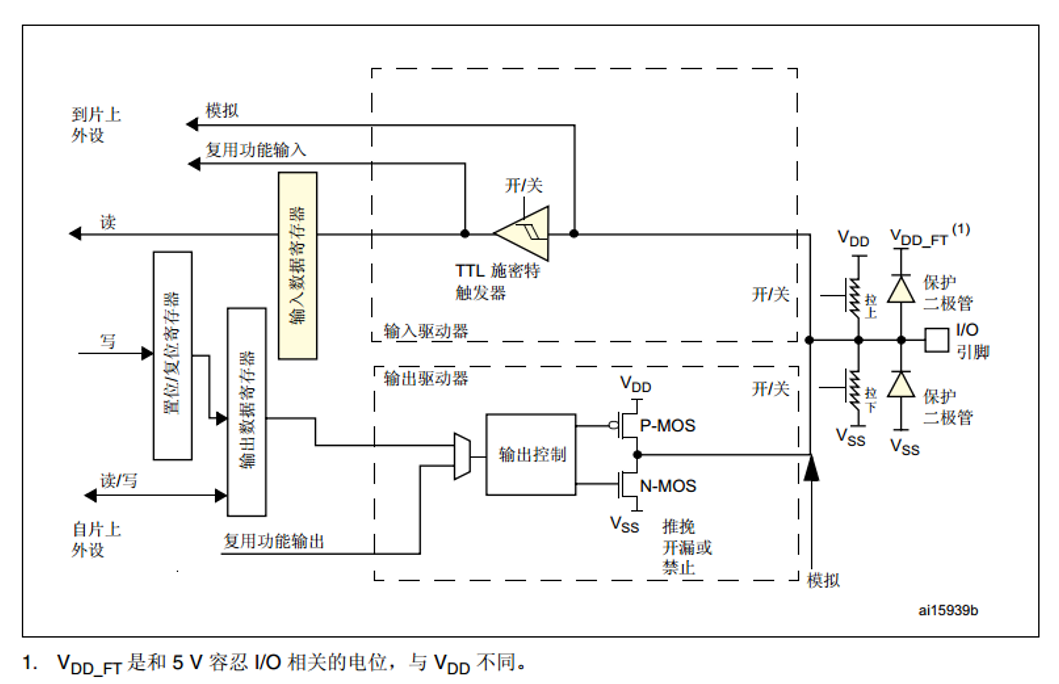 (2)输入的高电平为5V: 要用到 5V容错I/O端口 其中 VDD_FT(3.3V) 当输入为+5V时,上面的二极管导通,连接 VDD_FT(3.3V),将输入的5V稳压到3.3V,从而保护了电路