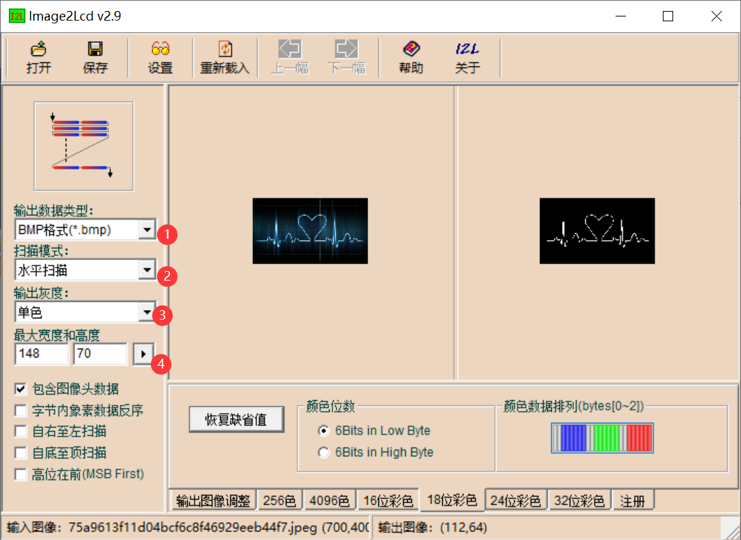 将要显示的照片进行格式转化,并且转换成像素为128*64以内的大小, 这里使用的是Img2lcd