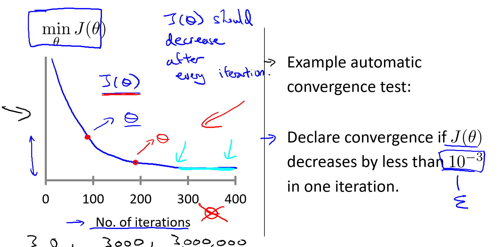 2.学习率梯度下降算法收敛所需要的迭代次数根据模型的不同而不同,不能提前预知,可以绘制迭代次数和代价函数的图表来观测算法在何时趋于收敛 也可以通过自动测试是否收敛的方法,例如将代价函数的变化值与某个阀值(例如 0.001)进行比较