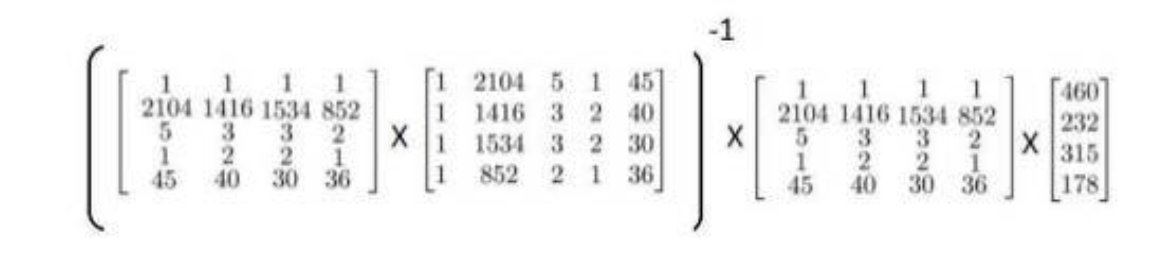 假设训练集特征矩阵为 𝑋(包含了 𝑥0 = 1)并且训练集结果为向量 𝑦,则利用正规方程解出向量 𝜃 = (𝑋𝑇 𝑋)(−1)𝑋𝑇𝑦