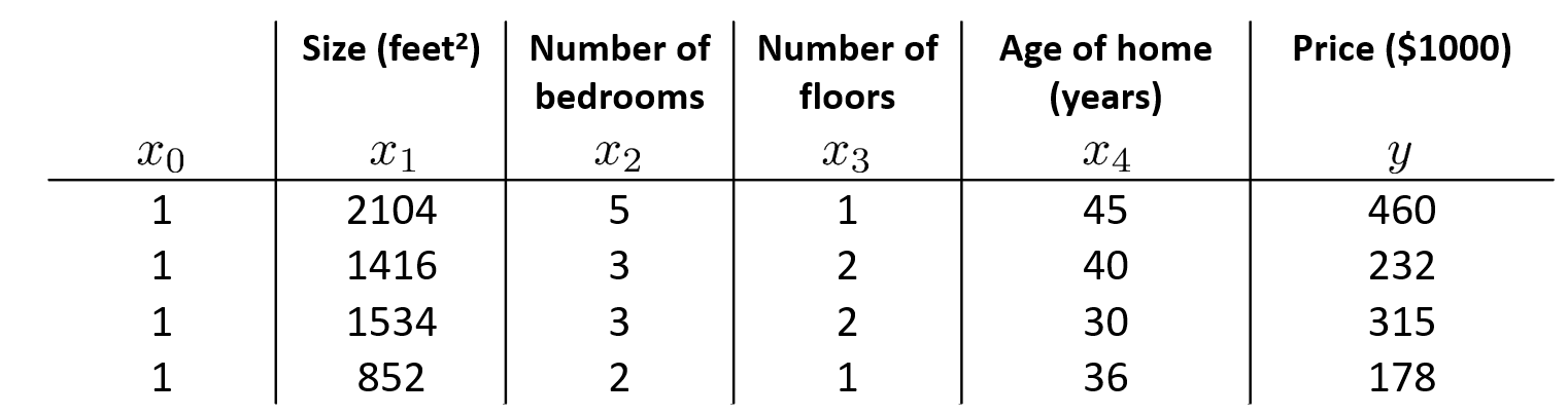eg: 数据集 了在上述数据中实现正规方程法,要在数据集中加上一列,以对应额外的特征变量x0 构建矩阵X ,它包含了训练样本的所有特征变量,以及向量y, 它包含了所有的预测值