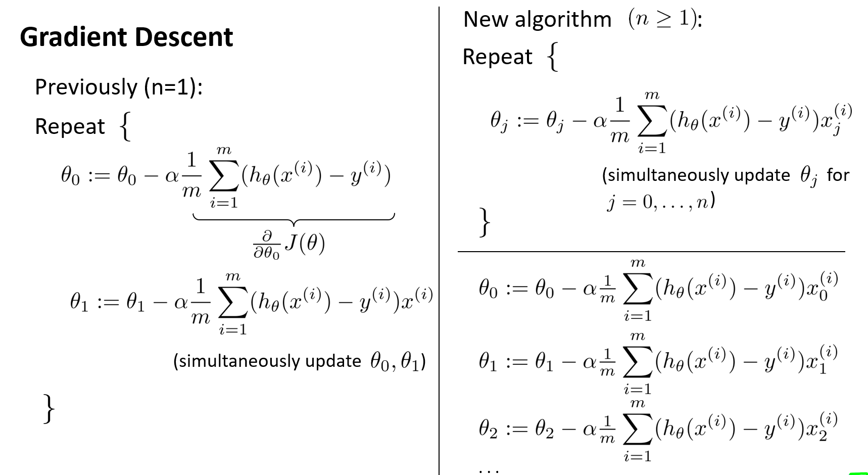 多变量线性回归的批量梯度下降算法为: 单变量线性回归与多变量线性回归对比: