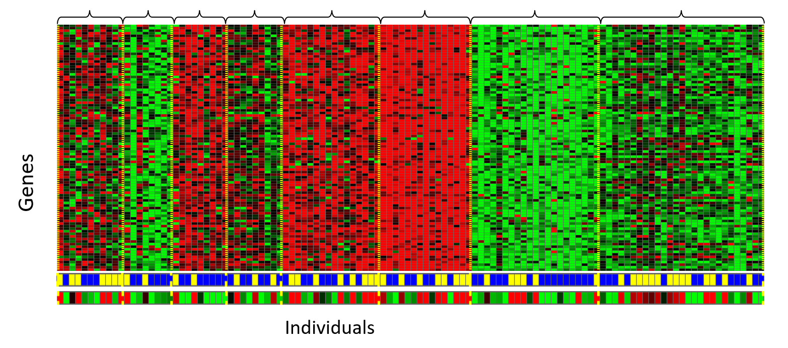 eg2: 在基因学,一个 DNA 微观数据,输入一组不同个体,对其中的每个个体,分析出它们是否有一个特定的基因 要分析多少特定基因已经表达,这些颜色展示了相应的程度,即不 同的个体是否有着一个特定的基因。我们能做的就是运行一个聚类算法,把个体聚类到不同的类或不同类型的组
