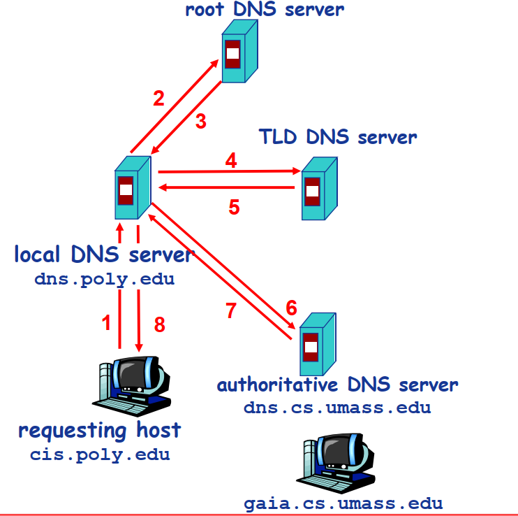 若Cis.poly.edu的主机想获得gaia.cs.umass.edu的IP地址 1–8一次查询并返回给主机,