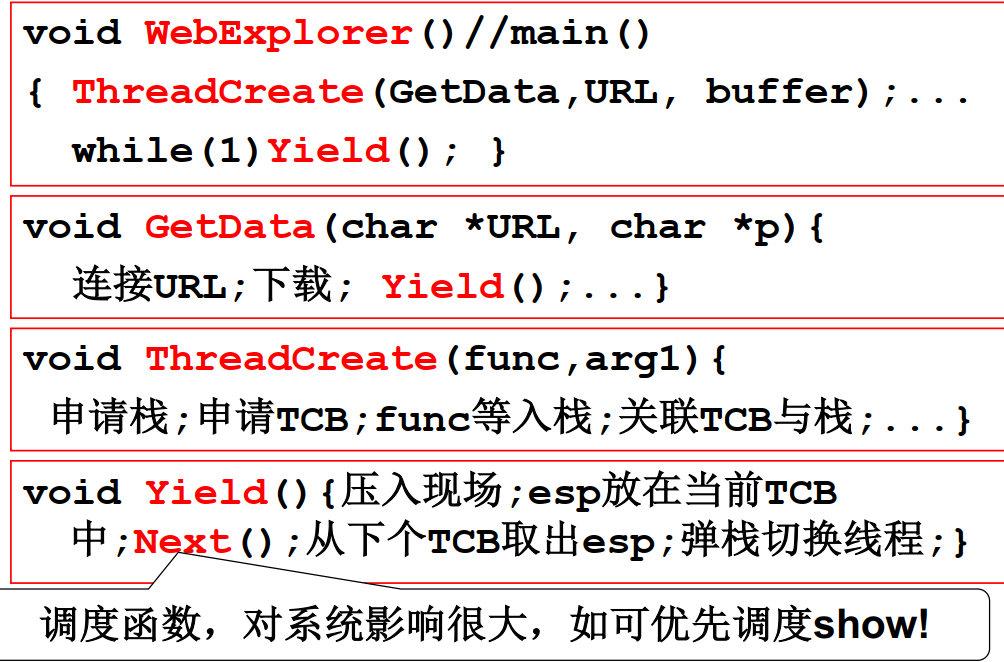用户级线程只能在用户态进行切换,进入内核后还是同一个进程,Yiled程序是用户程序,而核心级线程会进入内核进行切换,ThreadCreat是系统调用,内核也知道TCB,Yield程序也不是用户编写,而是内核程序,用户不可见,至于调度点,也是有操作系统决定