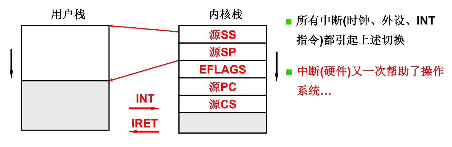 当线程进入内核的时候就应该建立一个属于这个线程的内核栈,通过INT中断进入内核。当线程下一次进入内核的时候,操作系统可以根据一些硬件寄存器来知道这个哪个线程,它对应的内核栈在哪里。**同时会将用户态的栈的位置(SS、SP)和程序执行到哪个地方了(CS、IP)都压入内核栈。**等线程在内核里面执行完(也就是IRET指令)之后就根据进入时存入的SS、SP的值找到用户态中对应栈的位置,根据存入的CS、IP的值找到程序执行到哪个地方。