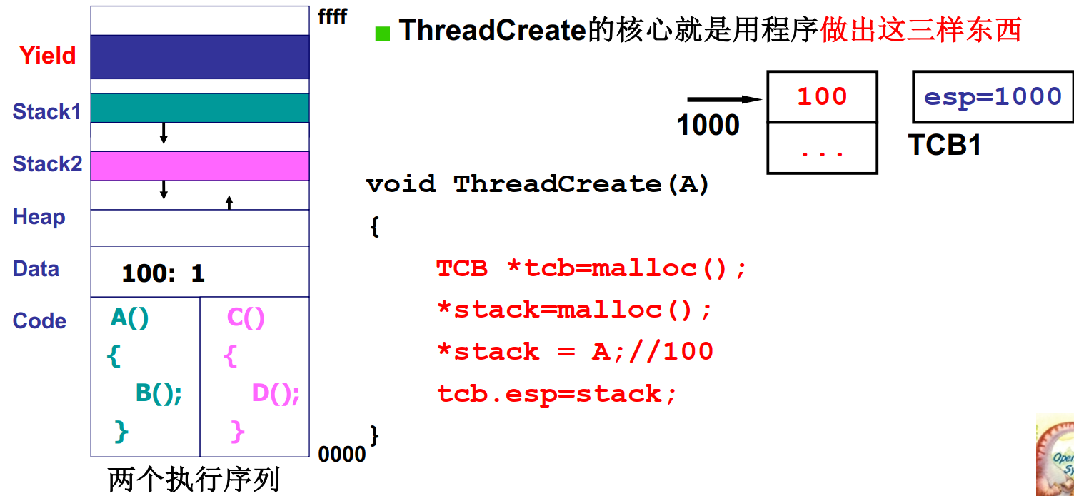 所以,要想从next的内核栈,经过弹栈,返回到next的用户栈,在我们调用ThreadCreate()创建线程的时候,我们就要将线程的内核栈和用户栈创建好并且将相应的数据压栈。、 1、申请内存,作为TCB 2、申请内存,作为内核栈 3、内核栈和用户栈相关联 4、TCB关联内核栈 如图