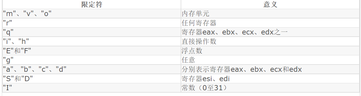 "g" 将输入变量放入eax,ebx,ecx,edx中的一个,或者作为内存变量 "X" 操作数可以是任何类型