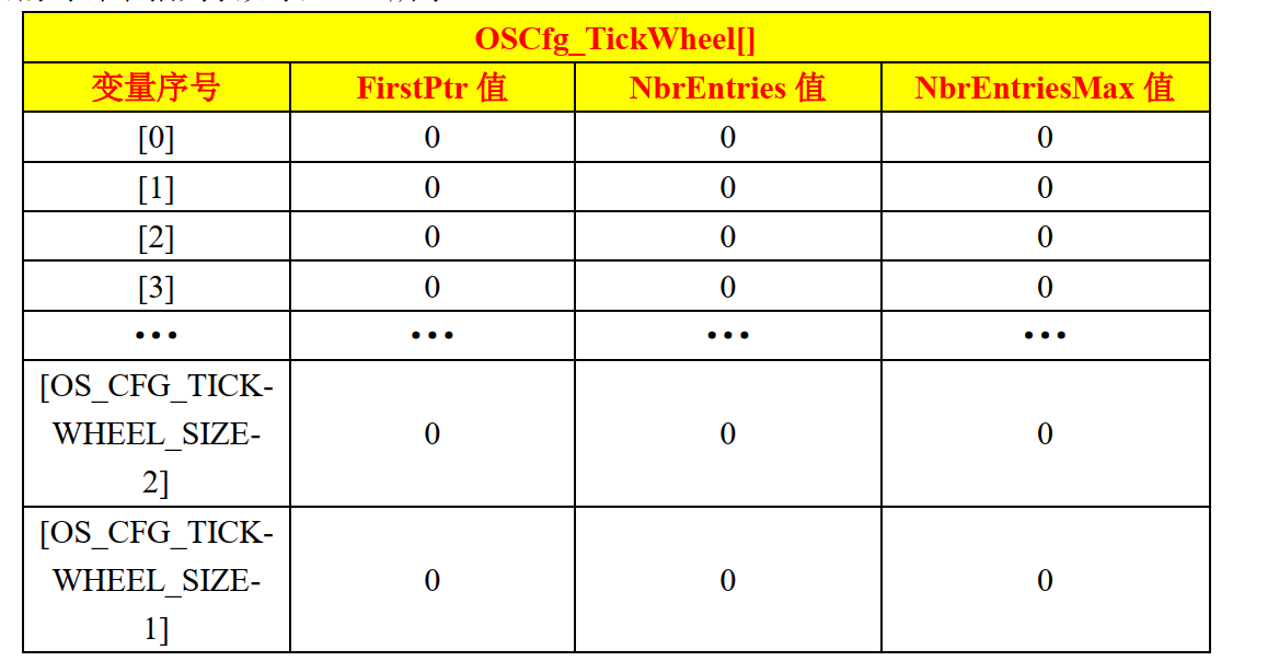 时钟节拍列表=数据表(OSCfg_TickWheel[])+计数器(OSTickCtr), 数据表的表项数目OS_CFG_TICK_WHEEL_SIZE一般设置为任务数的1/4左右,且最好为素数; 每当时钟节拍任务接收到时钟节拍ISR发送的信号量时,OSTickCtr自动+1 每次节拍中断发生时,只有其中一个表项上的任务可能延迟结束在使用时钟节拍列表需要先初始化时钟节拍列表,也就是将OSCfg_TickWheel[]数组中的元素清零
