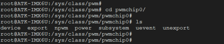 图 25.1.4 导出PWM 0表示一个编号,注意,每个PWM控制器(pwmchipX)下,使用export属性文件导出PWM时,编号都是从0开始;因为I.MX6U每个控制器都只有一路PWM,所以都只能使用编号0,如下所示: echo 0 > /sys/class/pwm/pwmchip0/export #导出PWM1 echo 0 > /sys/class/pwm/pwmchip1/export #导出PWM2 echo 0 > /sys/class/pwm/pwmchip2/export #导出PWM3 echo 0 > /sys/class/pwm/pwmchip3/export #导出PWM4 echo 0 > /sys/class/pwm/pwmchip4/export #导出PWM5 echo 0 > /sys/class/pwm/pwmchip5/export #导出PWM6 导出成功后会在pwmchipX(X表示数字0~7)目录下生成一个名为pwm0的目录,如图 25.1.4所示,稍后介绍。 unexport:将导出的PWM删除。当使用完PWM之后,我们需要将导出的PWM删除,譬如: echo 0 > unexport 写入到unexport文件中的编号与写入到export文件中的编号是相对应的;需要注意的是,export文件和unexport文件都是只写的、没有读权限。 如何控制PWM 通过export导出之后,便会生成pwm0这个目录,我们进入到该目录下看看: