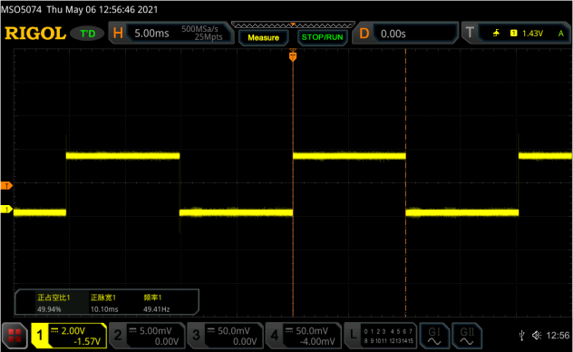 图 17.3.3 测试结果 从图中可以看出,由应用程序所控制产生的PWM波其周期为50Hz,占空比为50%,与程序实际设置的情况是相符合的。