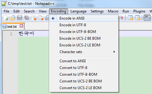 如果你身边有一个韩文系统,也装一个Notepad++,默认还是ANSI编码,你可以输入“한국어”,发现也能正常显示: