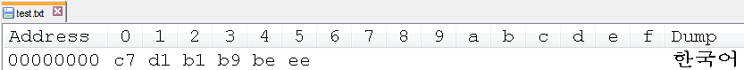 同样,用十六进制编辑器打开内容为“한국어”的test.txt文件: