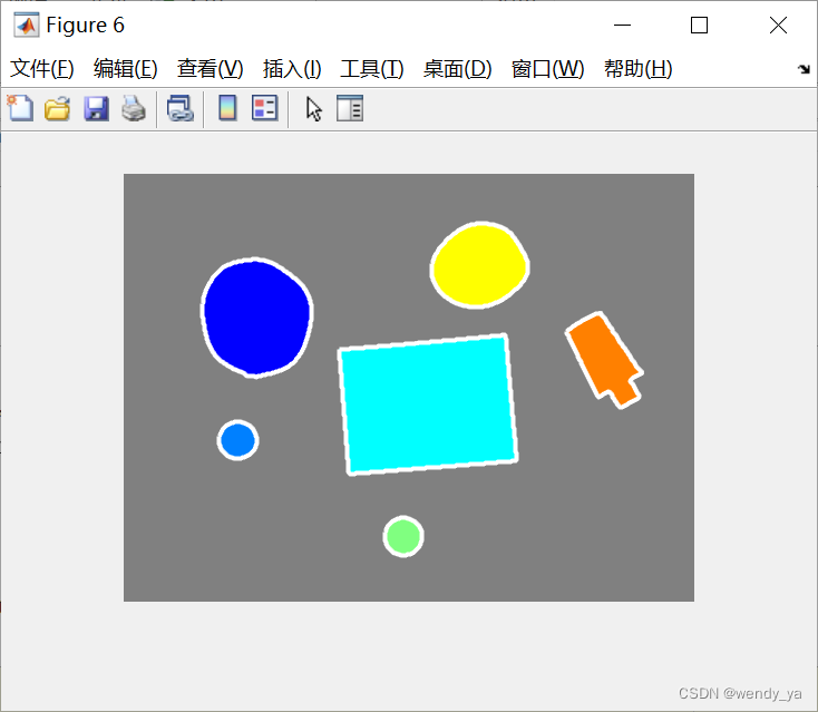 figure(6),imshow(label2rgb(L,@jet,[.5 .5 .5]))%标记矩阵L转化为RGB图像