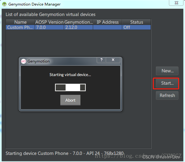 在 genymotion 界面点击 add 新建一个 AVD,我这里选择的是 API24,分辨率是 768*1280 的设备,这个版本的 genymotion 貌似都没有小屏的,大小根据自己显示屏的大小来选择,以防选择过大,影响调试 选择好后,点击next,下载镜像,网不好的需要耐心等待一段时间