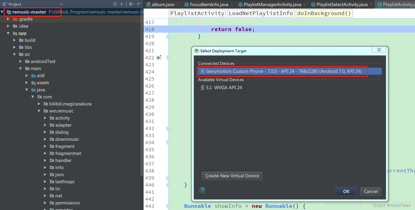 例如下面运行 github 上一个开源项目,选择配置好的 genymotion 设备就可以愉快调试了