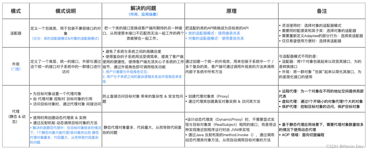 5.2 结构型 此处主要讲解常见的是:适配器模式、代理模式、门面(外观)模式。 具体介绍请看文章: