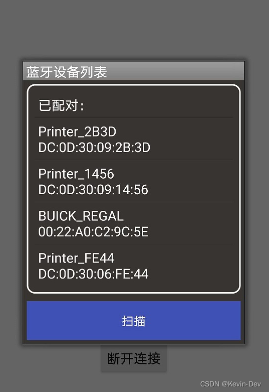 - 点击一个列表item的时候 即表示连接此设备,通过setResult返回该item对应的设备mac地址